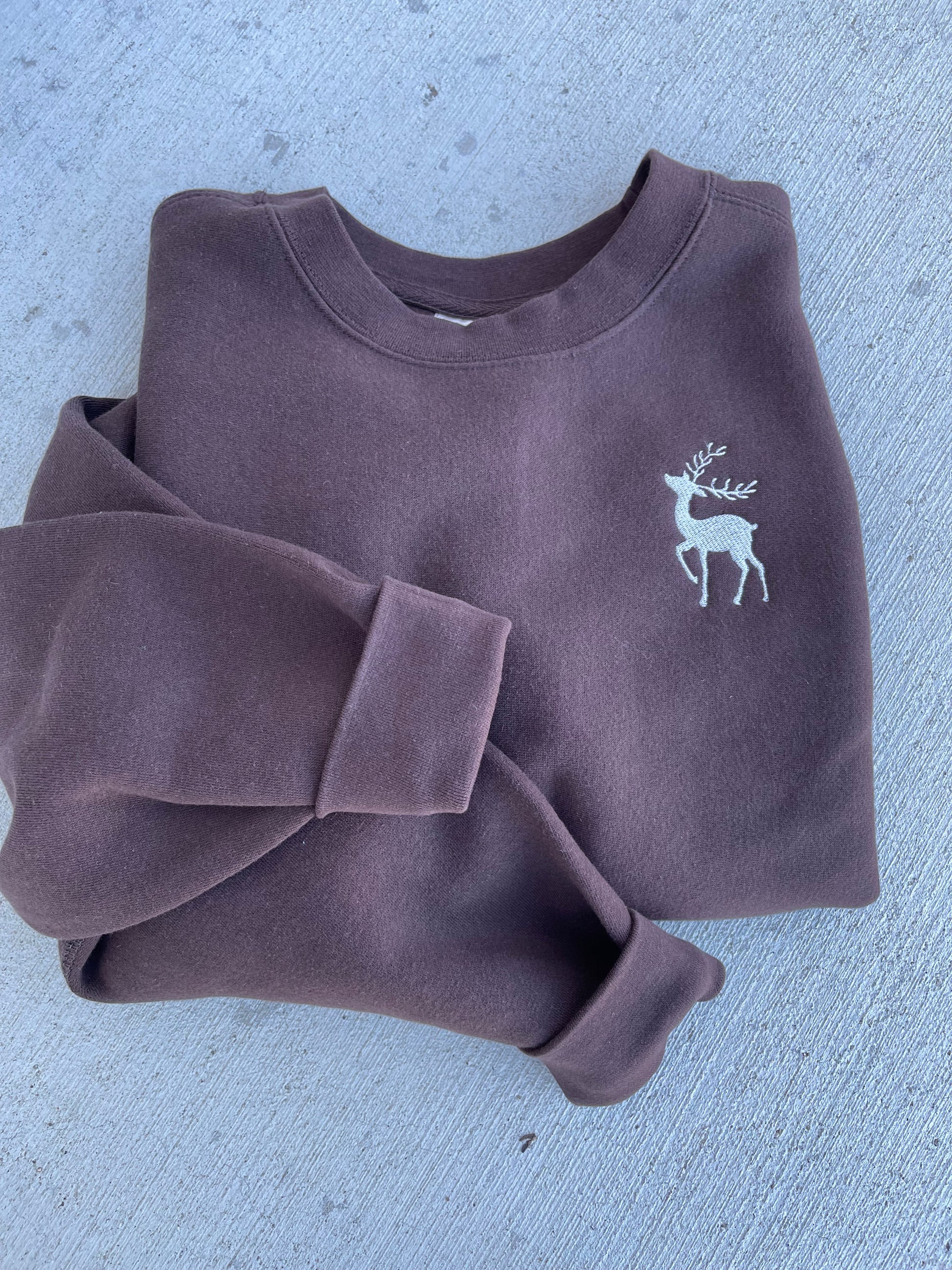 This is a super amazing deep chocolate crewneck with a silvery reindeer stitch!
